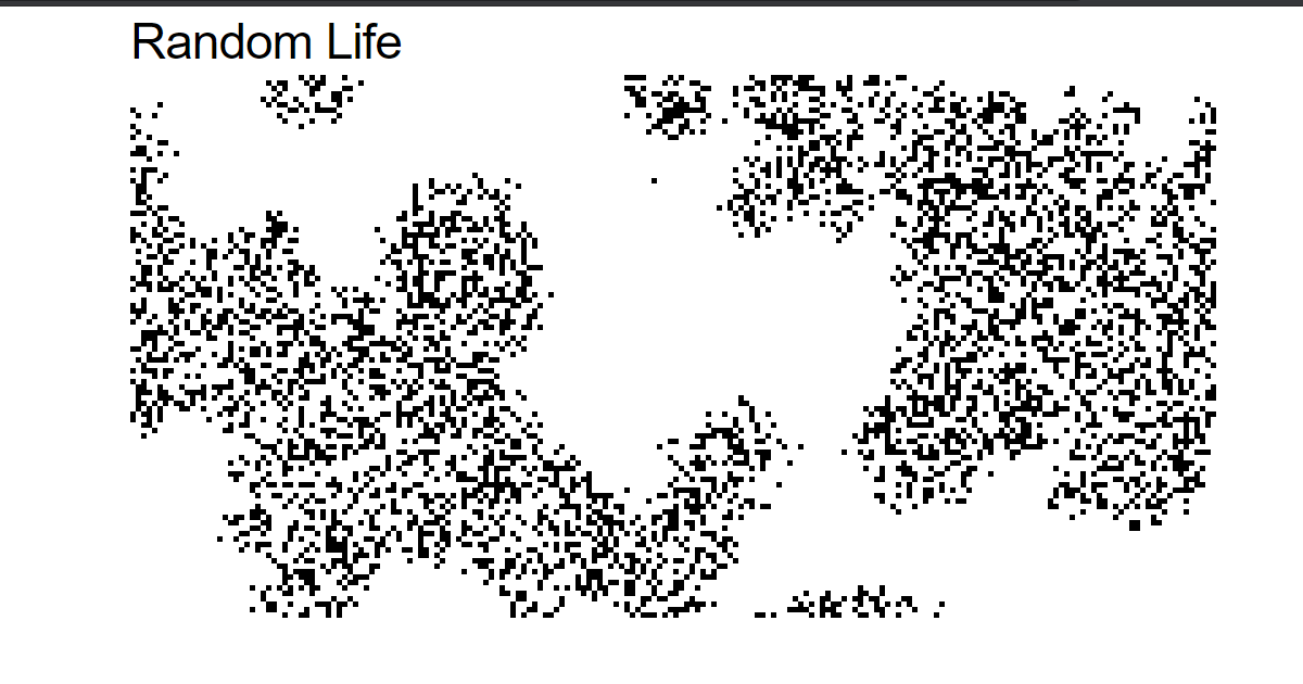 Random Life follows the same rules of Conway's Game of Life, but the neighbors are randomly chosen on initialization from cells within a certain radius. In this instance, the radius is 5. (Note, each cell gets assigned a different random pattern of neighbors. In this version, every cell follows the same random pattern)